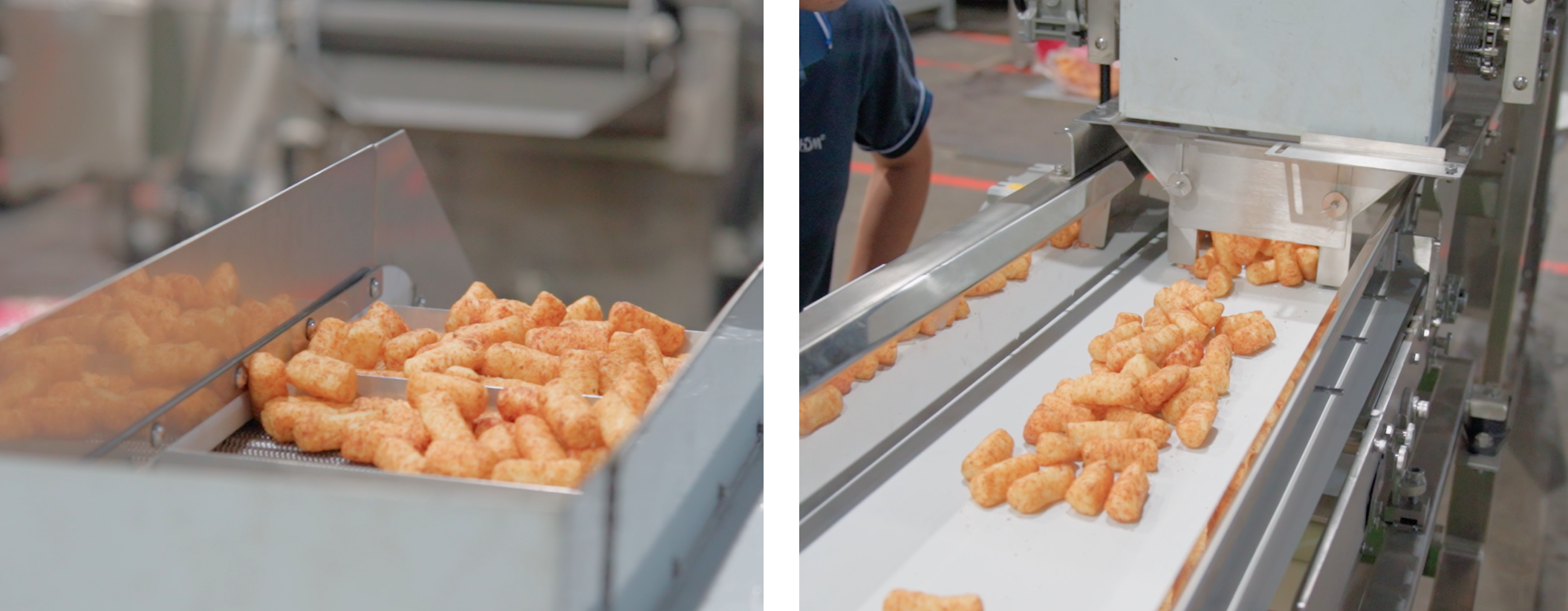 調味效果是否一致,關鍵在於原料的進料控制。TSHS的智慧餵料系統,採用 內建失重秤與動態秤重輸送機,精準監控每一次的入料重量,搭配噴液與灑粉系統,確保每一口產品調味濃淡一致、風味穩定。