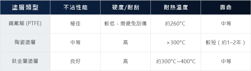 不同不沾塗層的比較:鐵氟龍、陶瓷與鈦金屬
