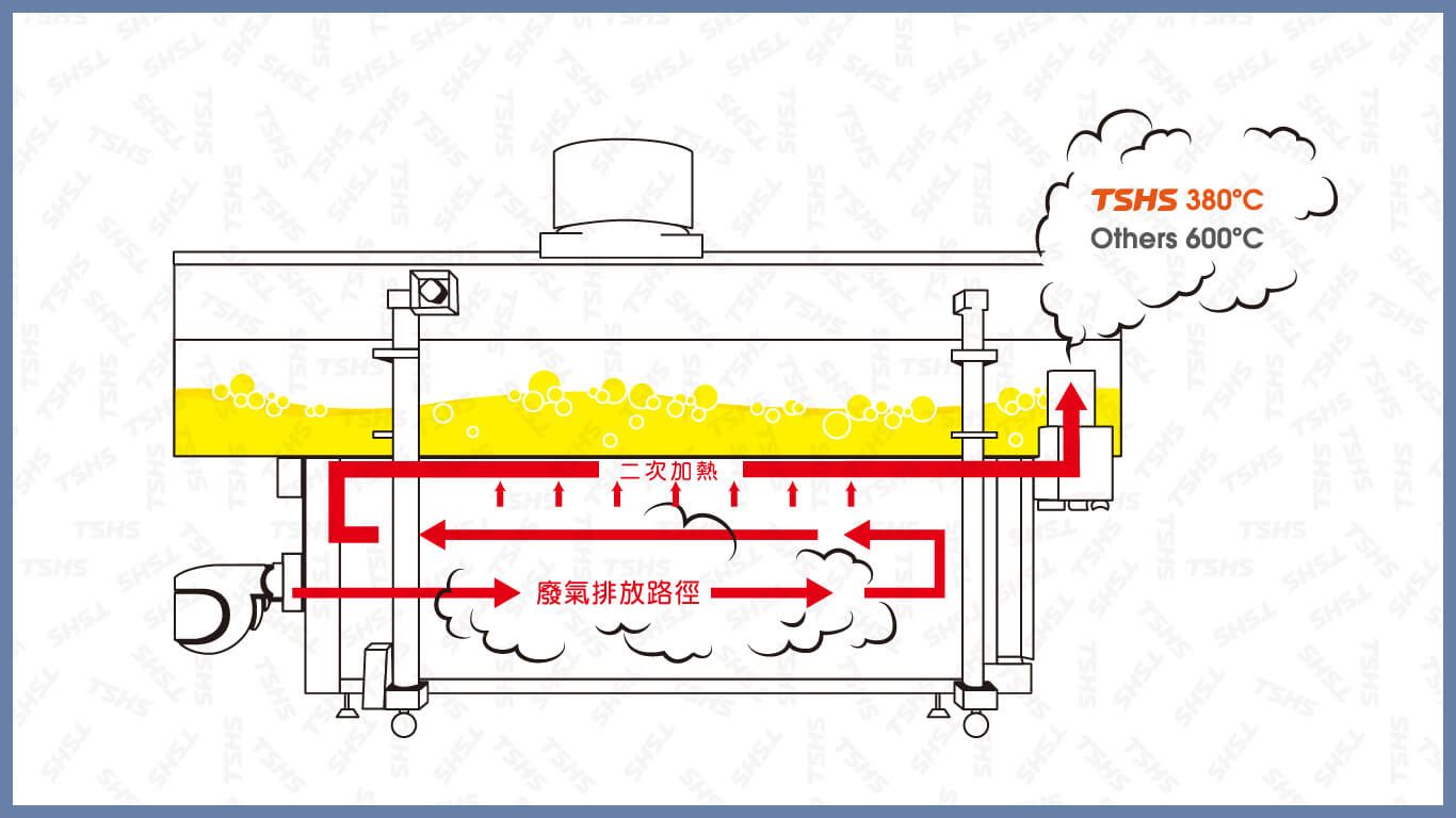 熱能回收率高:總興公司對於任何一點能源的浪費也不會忽視,對於排氣的廢熱能夠有效的利用,有效回收熱能達20%。熱能交換率高:富來應系列油炸機獨有的熱傳導設計中能有效提升熱交換效率。由廢氣排放溫度來看,富來應系列油炸機廢氣排放溫度約為400度,與他牌廢氣排放溫度達600多度相比,富來應系列油炸機廢氣排放溫度能降低約200度,證明熱交換效率有效提高。