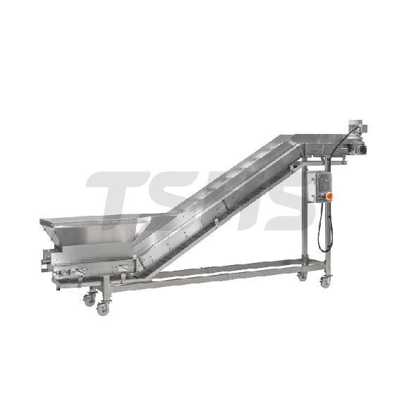 海鮮處理加工廠|TSHS爬坡式輸送機可用於魚類、蝦類等海鮮產品清洗後的食品加工輸送線,或在蒸煮、熟化加工後運送至下階段的製程,避免人工在高溫或濕滑的環境中進行搬運作業,降低工安風險,同時保持產品衛生並提高自動化水平。
