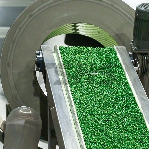 總興公司油炸青豆生產線配置連續式的篩選設備,依照客戶的需求,利用篩選桶特定尺寸的網孔,自動且連續式地將大小不符的青豆篩選出來,如此便能輕鬆掌握產品的大小,維持產品品質穩定,降低產品的差異性。